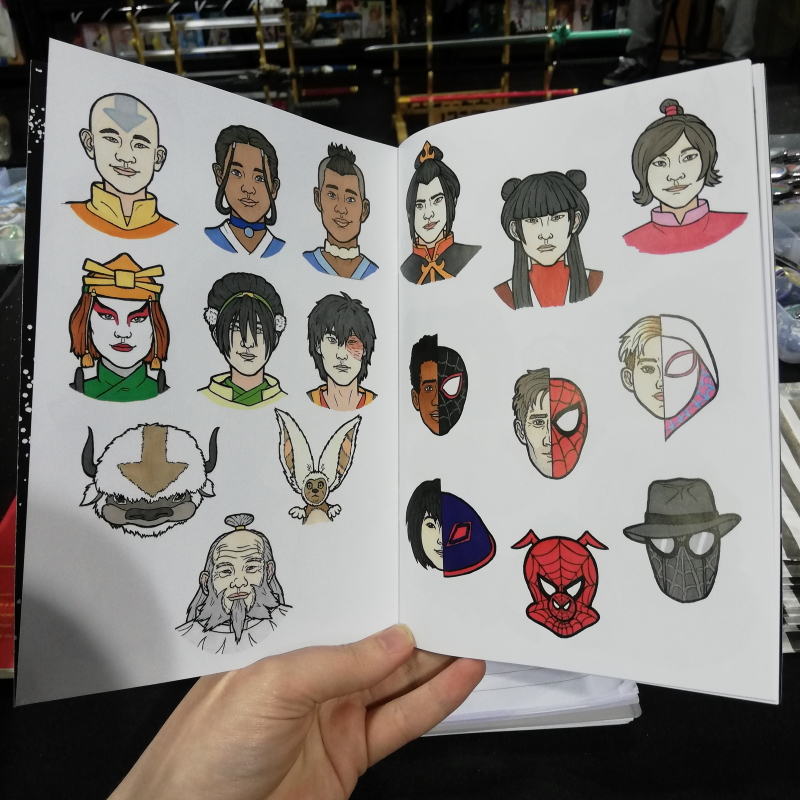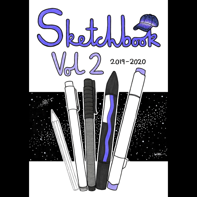 A 20 page A5 zine of sketchbook content and other drawings from 2019/20, including designs for button badges, character design sketches, emoji challenge prompt fills, full page illustrations and more.