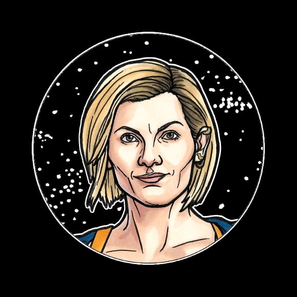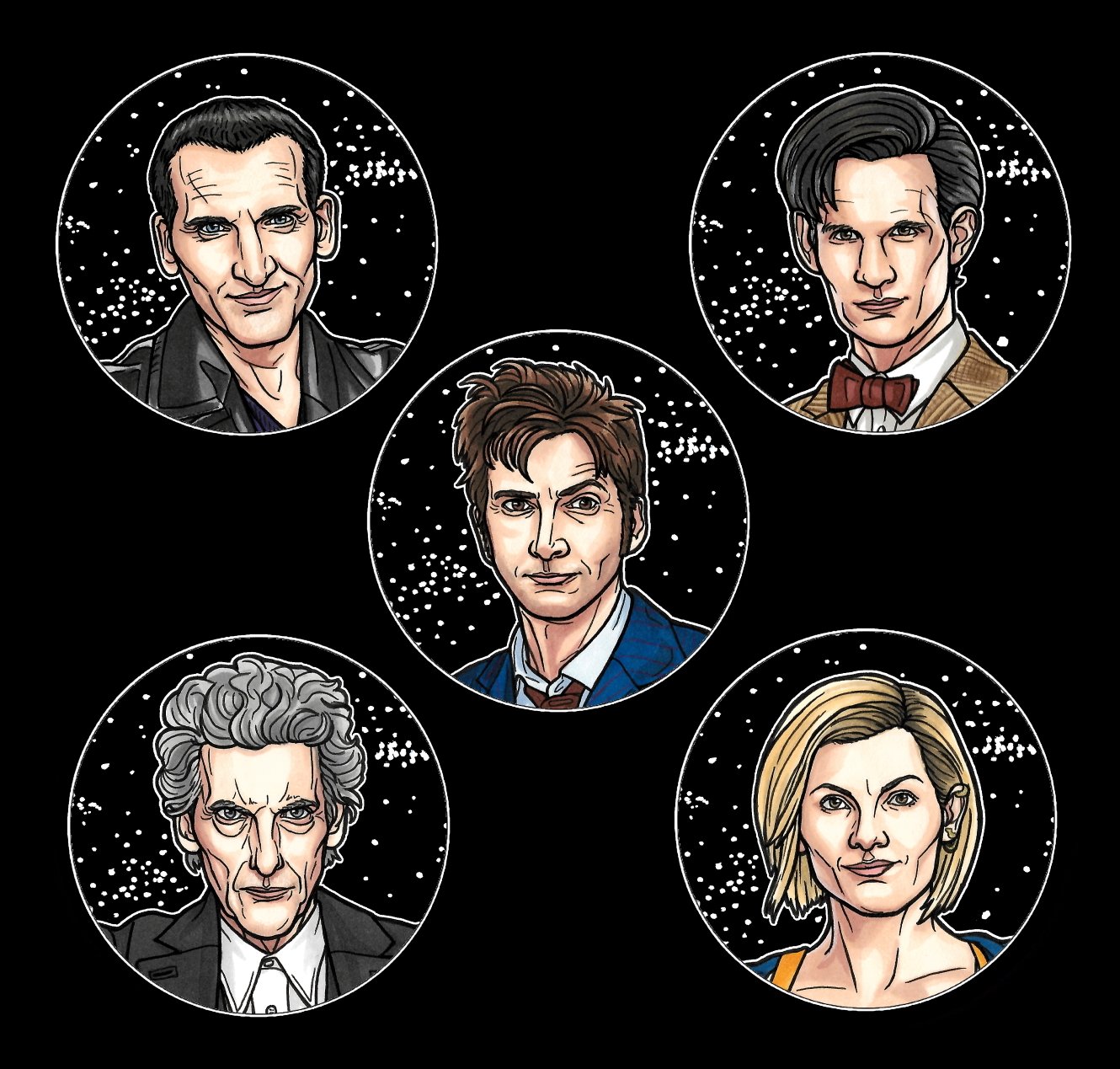 36mm button badges depicting versions of the Doctor from Doctor Who. Available individually or as a set of 5.